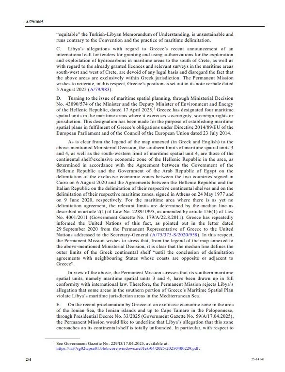 Αναρτήθηκε στον ΟΗΕ στις 12 Σεπτεμβρίου η ρηματική διακοίνωση της Αθήνας με την οποία απαντά στις διεκδικήσεις της Λιβύης.