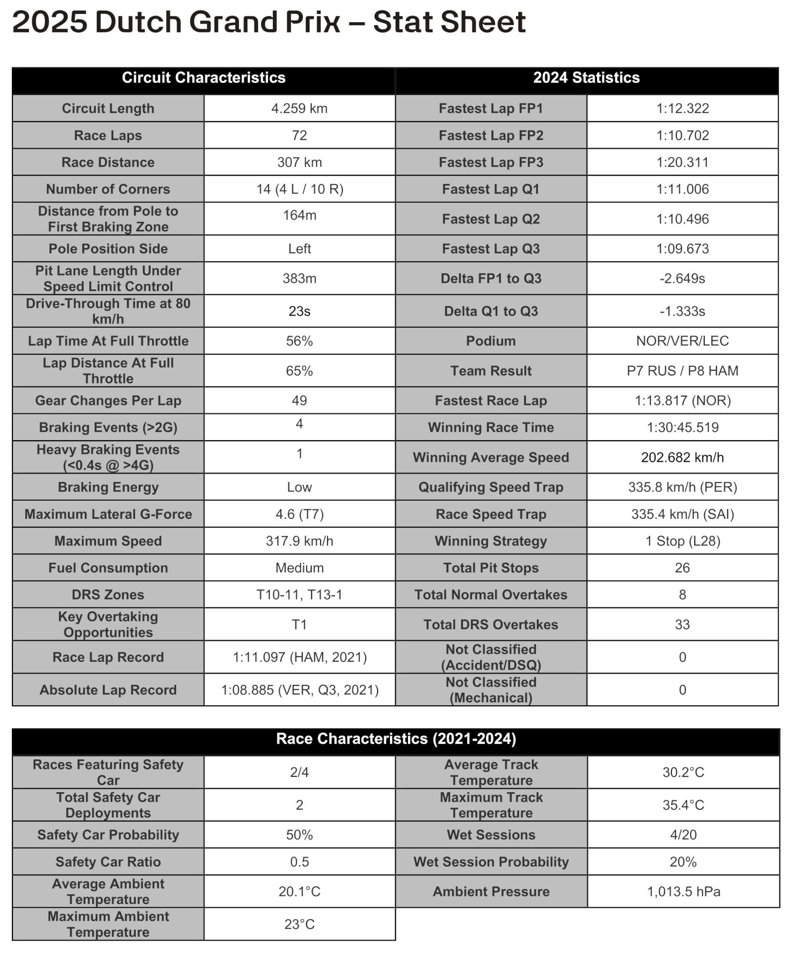Οι ομάδες επιλέγουν ρυθμίσεις αεροτομών που παράγουν υψηλές τιμές αεροδυναμικού φορτίου. Μόνο το Μονακό και η Ουγγαρία απαιτούν περισσότερη αεροδυναμικά παραγόμενη κάθετη δύναμη από το Zandvoort, το οποίο διαθέτει τον τρίτο πιο σύντομο χρόνο γύρου της σεζόν έπειτα από το Red Bull Ring και το Interlagos.