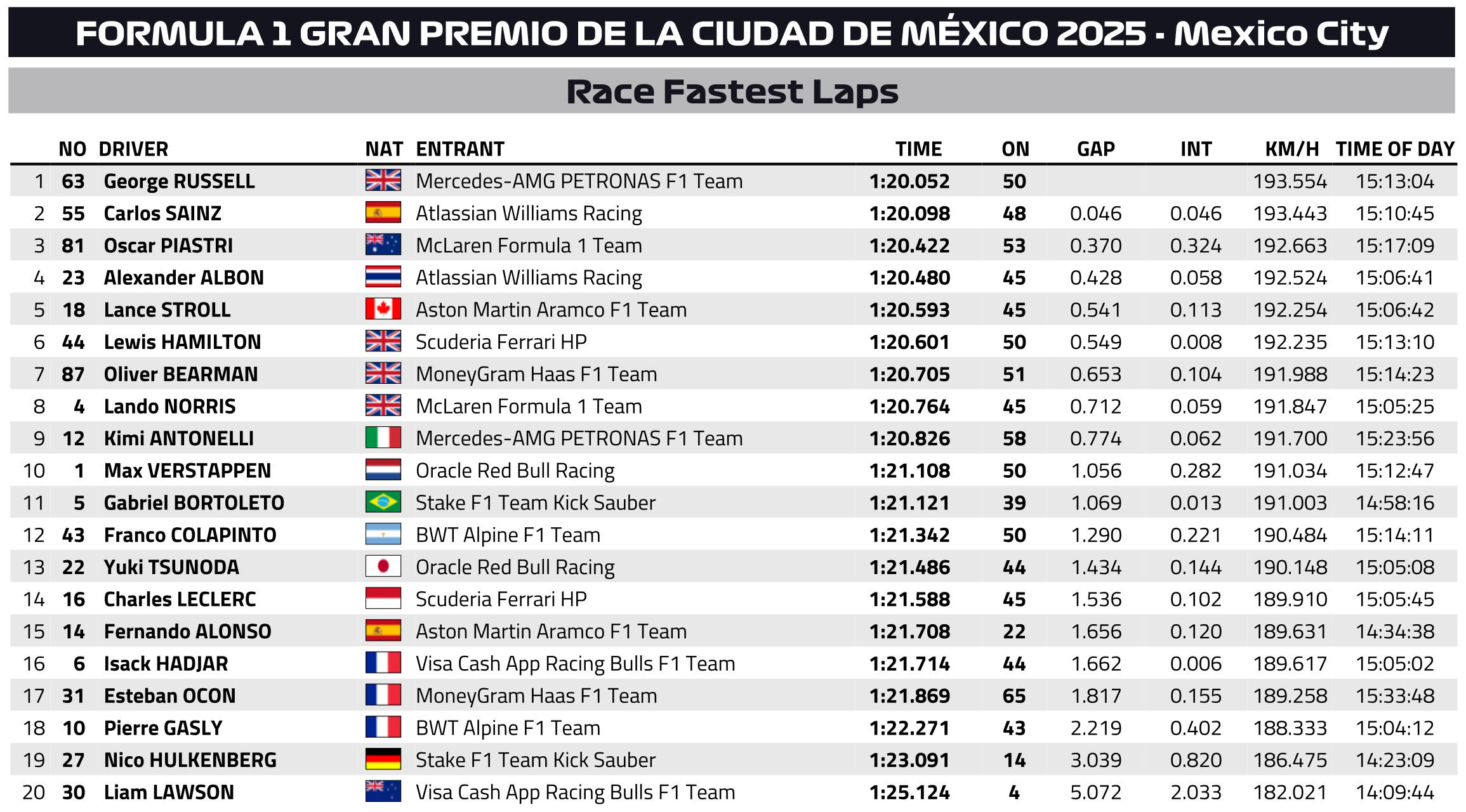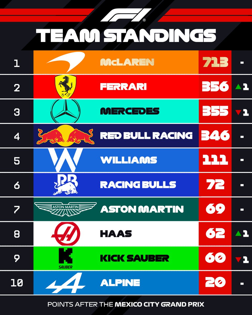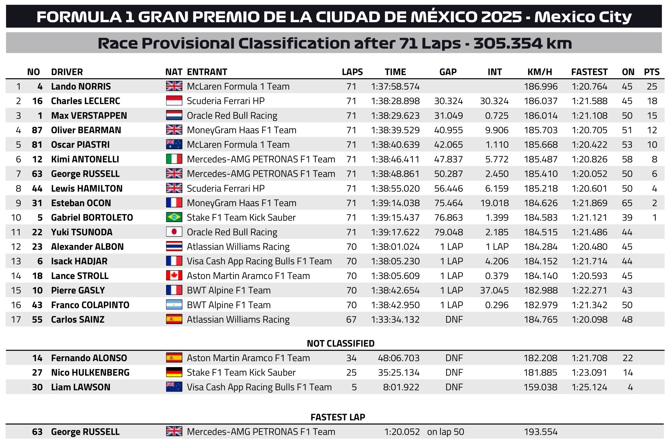 Ο Lando Norris κατέκτησε μία εξαιρετική νίκη στο Grand Prix Πόλης Μεξικού, όντας κυρίαρχος καθ’ όλη τη διάρκεια του αγώνα, για να τερματίσει με διαφορά μισού λεπτού από τον 2ο, Charles Leclerc. Η McLaren κατάφερε να επιστρέψει στις νίκες για πρώτη φορά από το GP Ολλανδίας έχοντας φανερά ταχύτερο ρυθμό αγώνα – τουλάχιστον στα χέρια του Βρετανού. Ο Norris έκανε πολύ καλή εκκίνηση και δεν απειλήθηκε ποτέ στη συνέχεια, εφόσον οι δύο Ferrari που βρίσκονταν πίσω του αρχικά, ήταν αναγκασμένες να κάνουν lift & coast, σηκώνοντας το πόδι από το γκάζι 50 μέτρα πριν από τις ζώνες φρεναρίσματος.