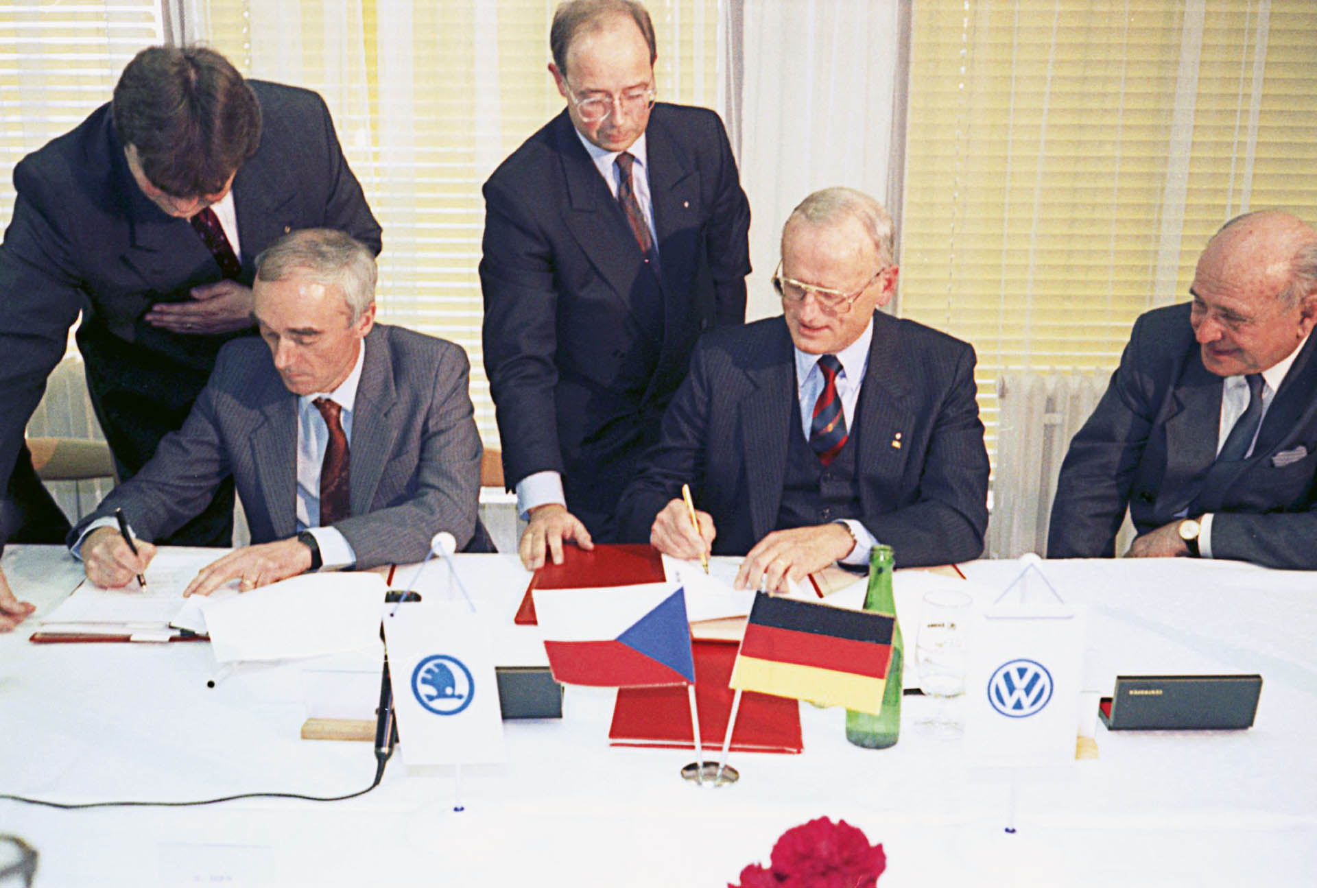 Κατά τη διαδικασία ιδιωτικοποίησης της κρατικής αυτοκινητοβιομηχανίας, η Volkswagen αναδείχθηκε σε έναν από τους βασικούς υποψηφίους μεταξύ 24 πιθανών εταίρων. Η συμφωνία για τη δημιουργία της κοινοπραξίας μεταξύ της τσεχικής κυβέρνησης και του Ομίλου Volkswagen υπογράφηκε στις 28 Μαρτίου 1991 από τον Υπουργό Βιομηχανίας Jan Vrba και τον Πρόεδρο της Volkswagen Carl Hahn. Αφού ο Όμιλος Volkswagen εκπλήρωσε τις συμβατικές του δεσμεύσεις, απέκτησε αρχικά το 31% της Skoda Auto στις 16 Απριλίου 1991, ποσοστό που αυξήθηκε σταδιακά στο 100% έως τις 30 Μαΐου 2000.