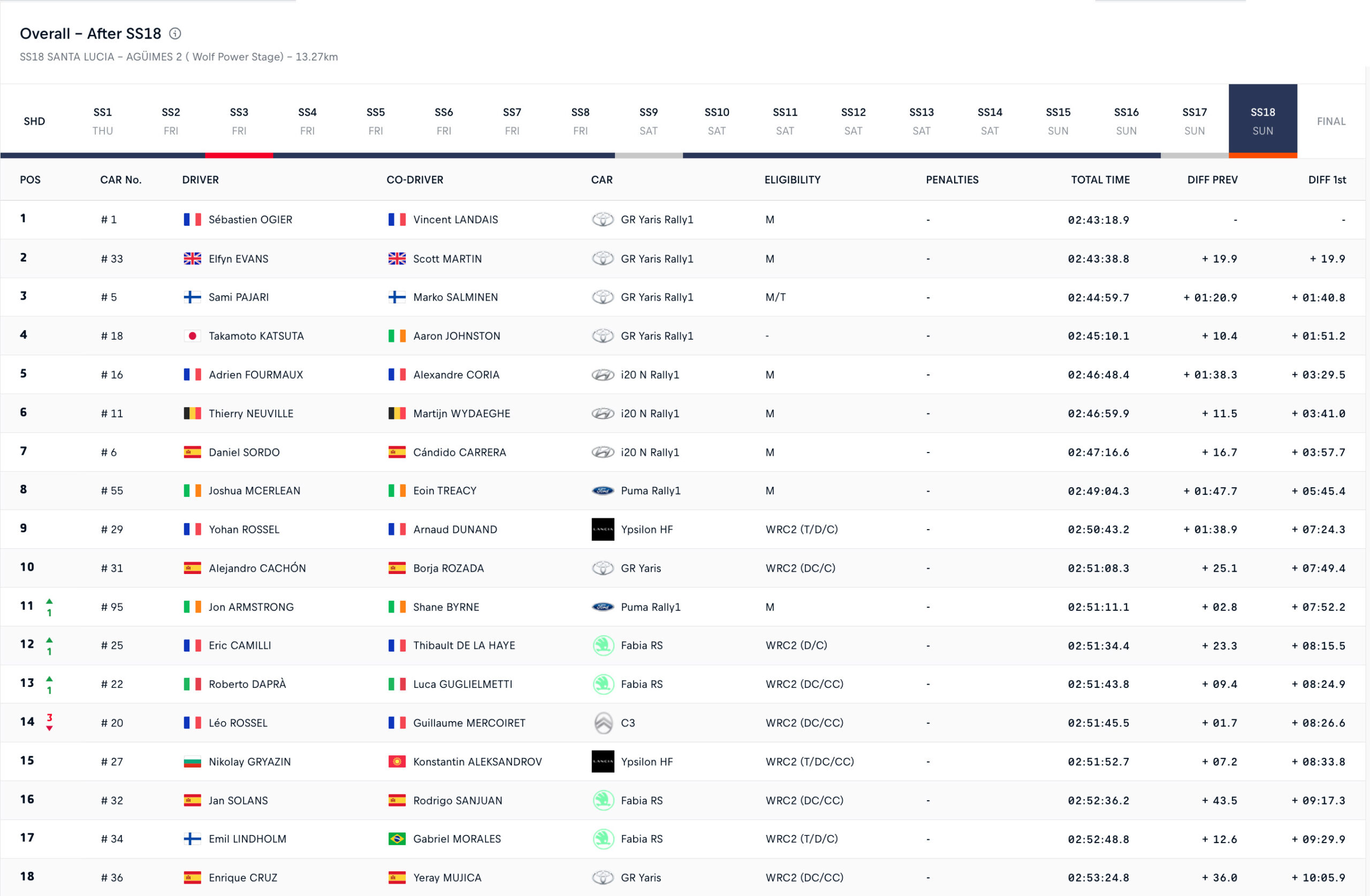 Ωστόσο, η προσπάθεια του Oliver Solberg να προκαλέσει για τη νίκη τον πολύπειρο Ogier κατέληξε σε δράμα για τον ίδιο. Ο Σουηδός, έχοντας καταφέρει να μειώσει τη διαφορά που τον χώριζε από τον επικεφαλής Γάλλο από τα 3,8 δλ. το βράδυ του Σαββάτου σε 2,2 δλ. έπειτα από τις δύο πρώτες ειδικές διαδρομές της Κυριακής, στις οποίες σημείωσε τον ταχύτερο χρόνο σε νωπή και ολισθηρή άσφαλτο, τα όνειρά του κατακρημνίστηκαν στην προτελευταία δοκιμασία του αγώνα (Ingenio – Valsequillo, 25,93 χλμ).