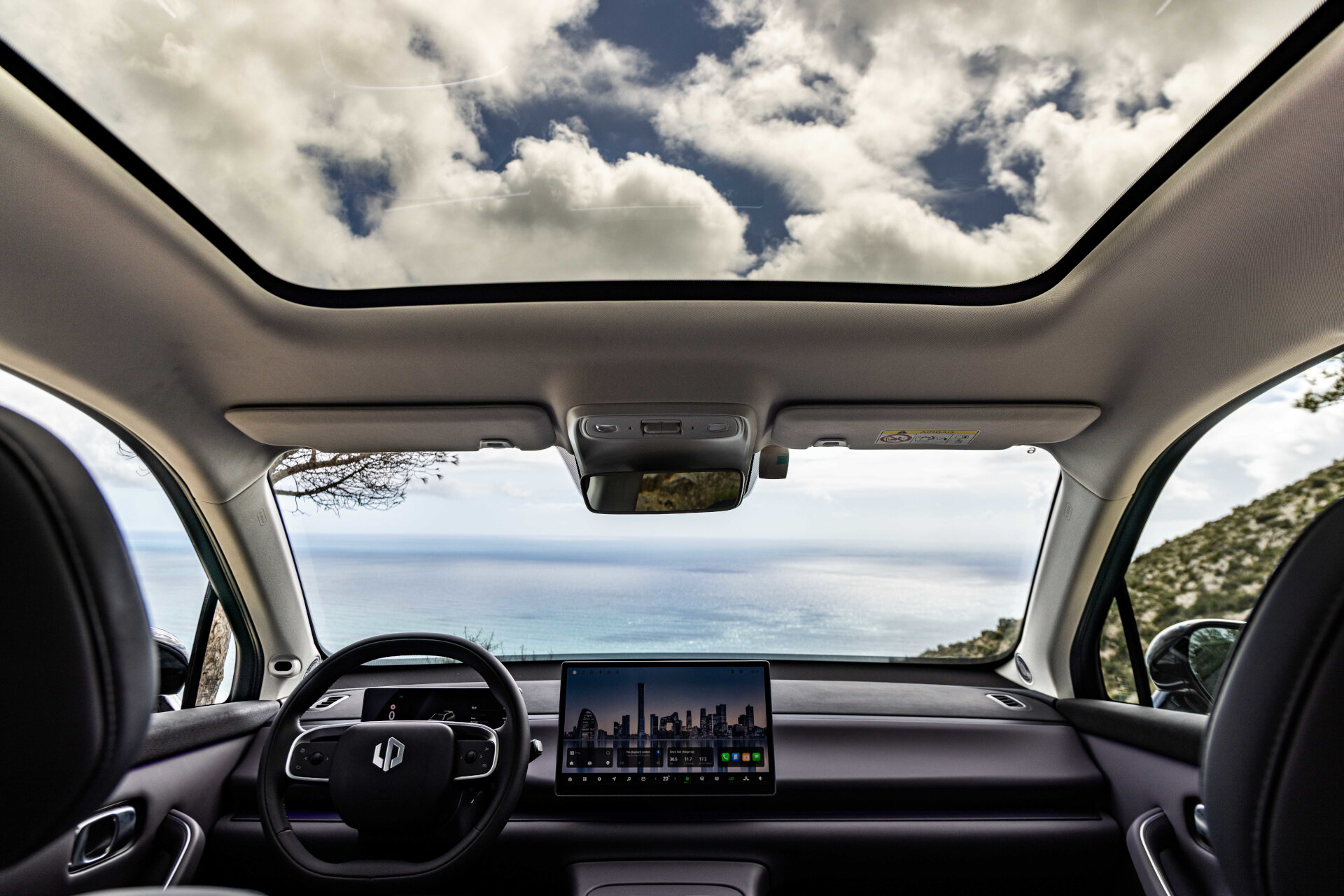 Στο ταμπλό δεσπόζει η ακόμη πιο μεγάλη κεντρική οθόνη 14,6” που έχει εντυπωσιακά γραφικά και φροντίζει για άριστη συνδεσιμότητα, πλοήγηση και ψυχαγωγία. Δεδομένου πως απουσιάζουν φυσικοί διακόπτες ακόμη και για τον χειρισμό κλιματισμό ή τη ρύθμιση των καθρεπτών, και όλες οι ρυθμίσεις γίνονται μέσα από την οθόνη, χρειάζεται χρόνος εξοικείωσης με το -σωστά δομημένο κατά τα άλλα- μενού της. Υπάρχει άλλωστε και ο φωνητικός βοηθός για να απλοποιήσει αρκετά την κατάσταση.