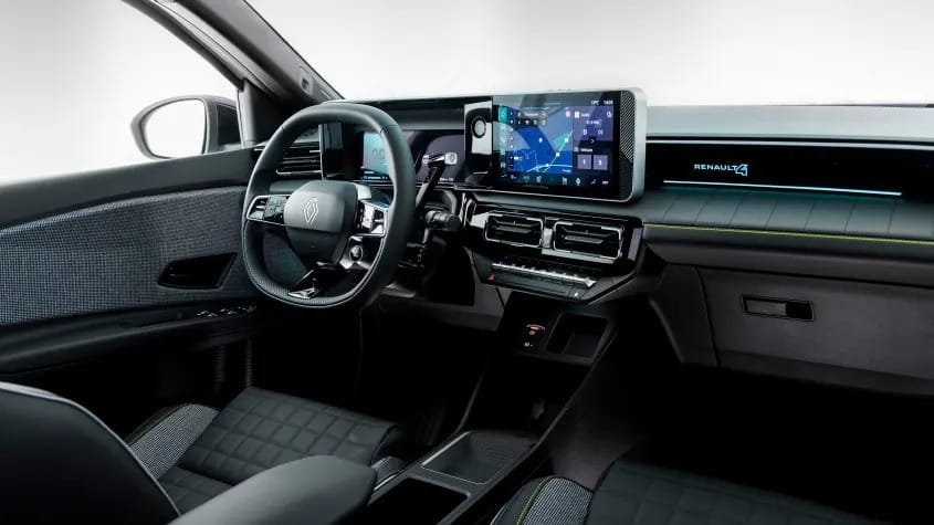 Στο εσωτερικό, η Renault επέλεξε συνειδητά βιώσιμα υλικά, με υφάσματα τύπου denim, καπιτονέ λεπτομέρειες και ραφές, σε έντονες αντιθέσεις. Μικρά ρετρό σημάδια, όπως η κεντημένη γαλλική σημαία και το διακριτικό λογότυπο R4, τονίζουν την ταυτότητά του.