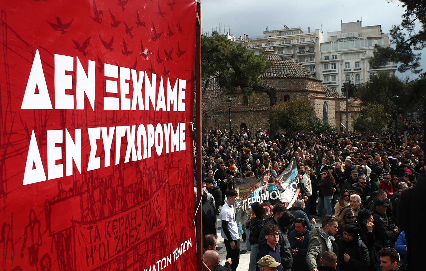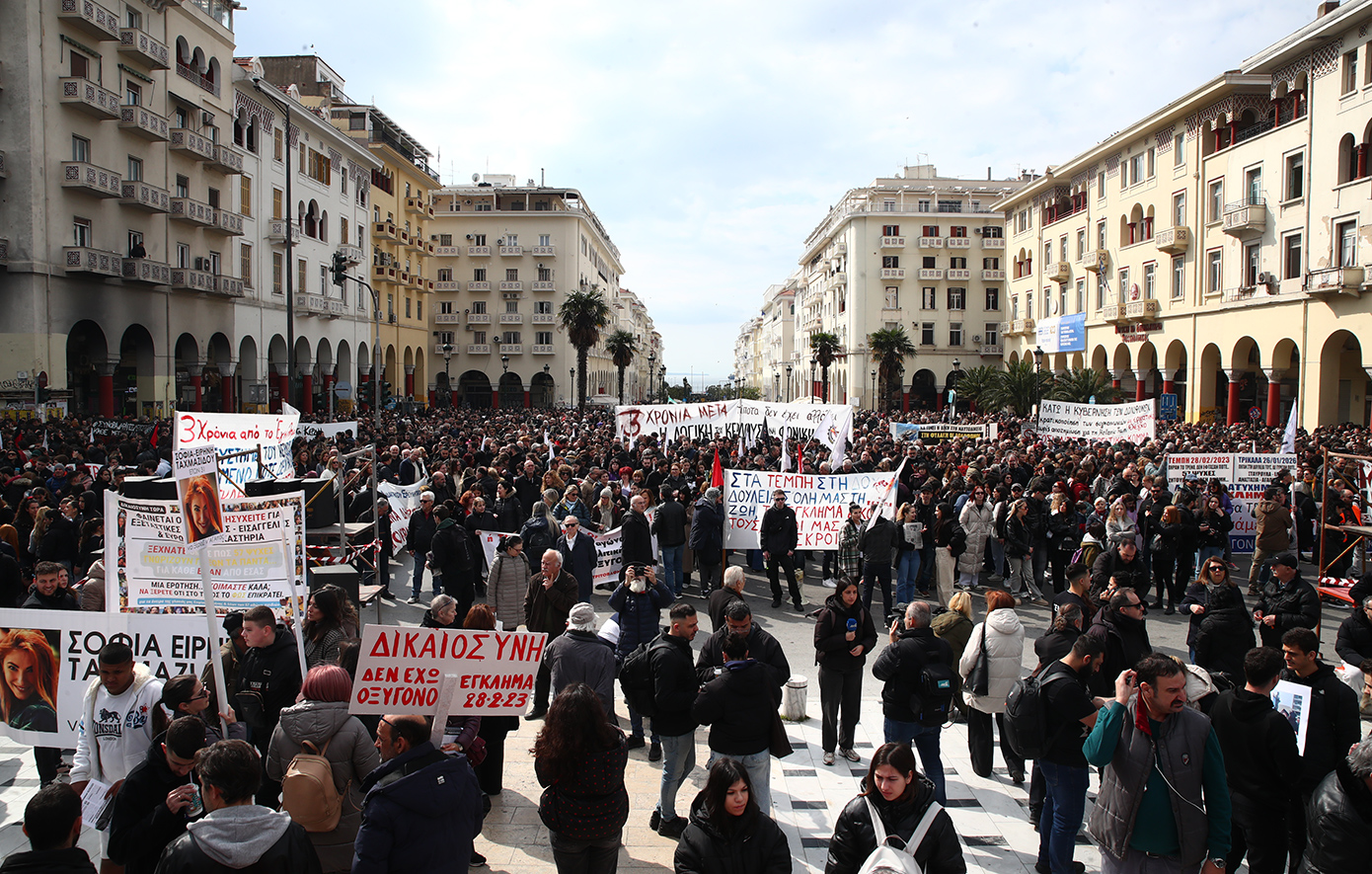 Οι συγκεντρωμένοι πολίτες, επί της πλατείας Ελευθερίας αλλά και στους γύρω δρόμους , επανέλαβαν το αίτημα για δικαιοσύνη αλλά και τερματισμό, όπως τόνισαν, «των πολιτικών κέρδους που γεννούν νέα Τέμπη».