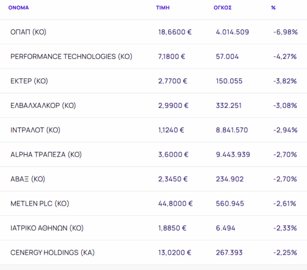 Οι μετοχές με τη μεγαλύτερη πτώση ήταν: