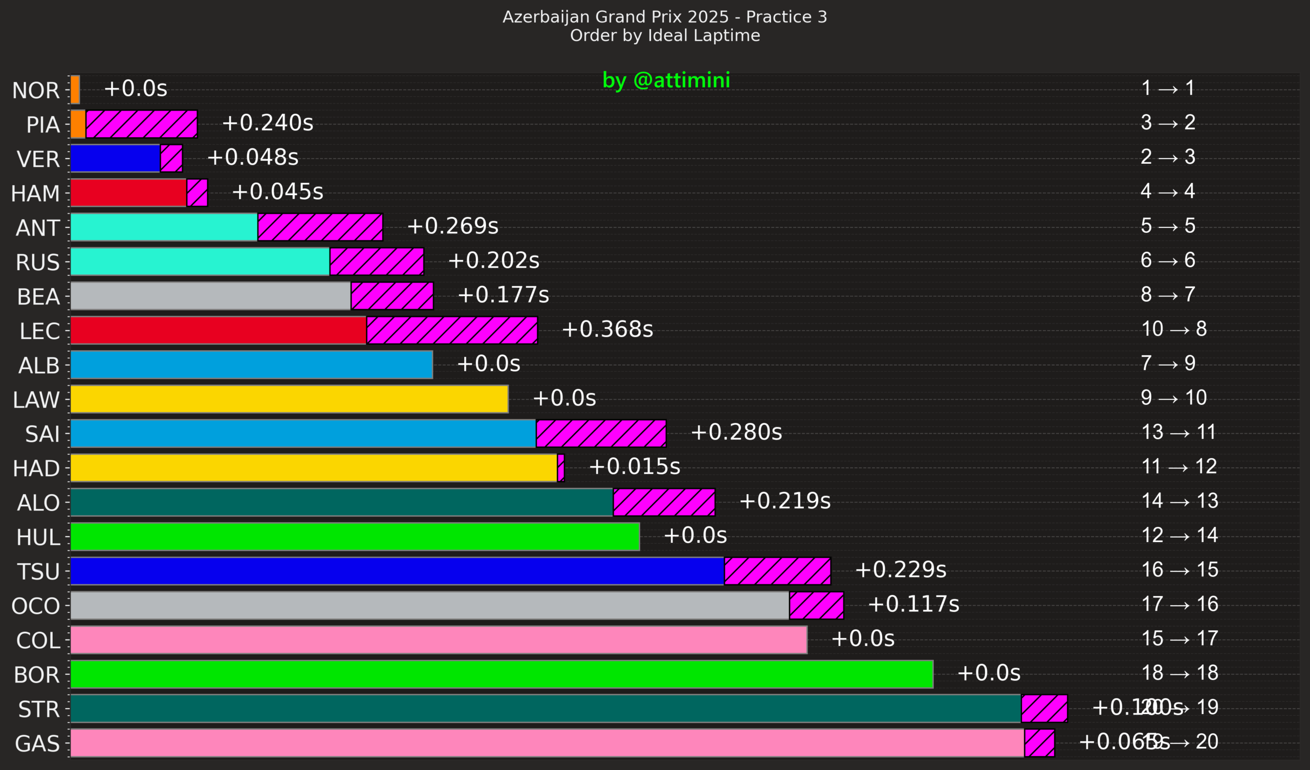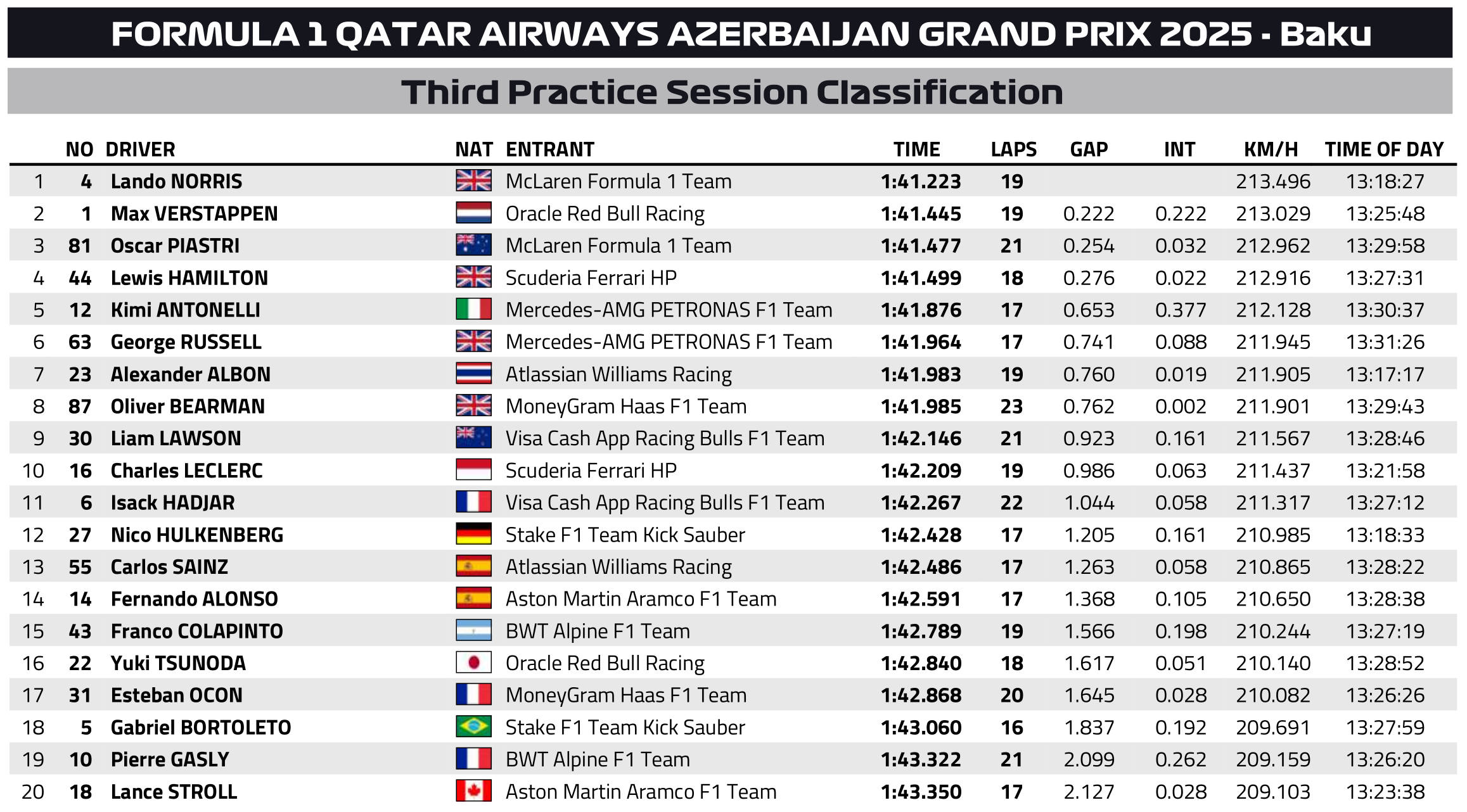 Με τις ελεύθερες δοκιμές του Grand Prix Αζερμπαϊτζάν να έχουν ολοκληρωθεί, o Lando Norris φαίνεται να βρίσκεται σε δυνατή θέση, παρότι είχε χάσει το δεύτερο μισό του FP2 λόγω λάθους του. Ο Βρετανός οδηγός της McLaren έγραψε έναν εξαιρετικό χρόνο στο FP3 με το δεύτερο σετ μαλακών ελαστικών και χωρίς τη βοήθεια slipstream. Κανείς δεν κατάφερε να πλησιάσει την επίδοση του Norris στη συνέχεια, παρότι ο Βρετανός οδηγός ξεκίνησε τη διαδικασία αναφέροντας ότι η αίσθηση ήταν χειρότερη σε κάθε στροφή, ενδεχομένως λόγω των ισχυρών ανέμων.