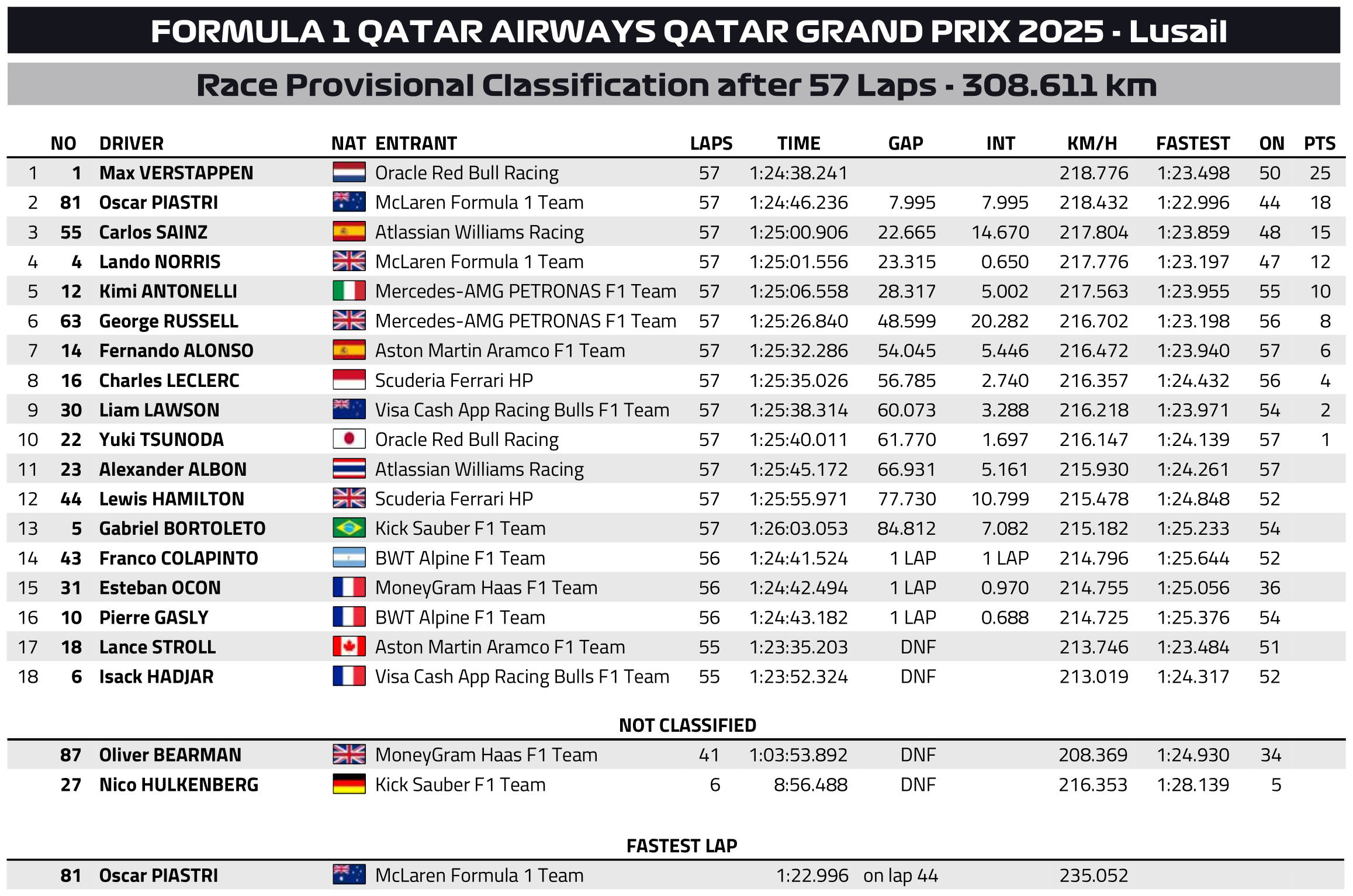 Αυτό επέτρεψε στον Norris να περάσει μπροστά και να πάρει άλλους δύο πολύτιμούς βαθμούς. Το λάθος του Antonelli θα μπορούσε στο τέλος να… κρίνει τον τίτλο, καθώς τώρα, αν ο Norris ανέβει στο βάθρο του GP Άμπου Ντάμπι, θα στεφθεί αυτομάτως Πρωταθλητής, ενώ με την 5η θέση σήμερα, δεν θα συνέβαινε αυτό και η διαφορά από τον Verstappen θα ήταν 10 βαθμοί. Ο Norris προσπάθησε να πιέσει και τον Carlos Sainz, που βρισκόταν μπροστά του, αλλά δεν πρόλαβε να του επιτεθεί. Οπότε ο Βρετανός περιορίστηκε στην 4η θέση.