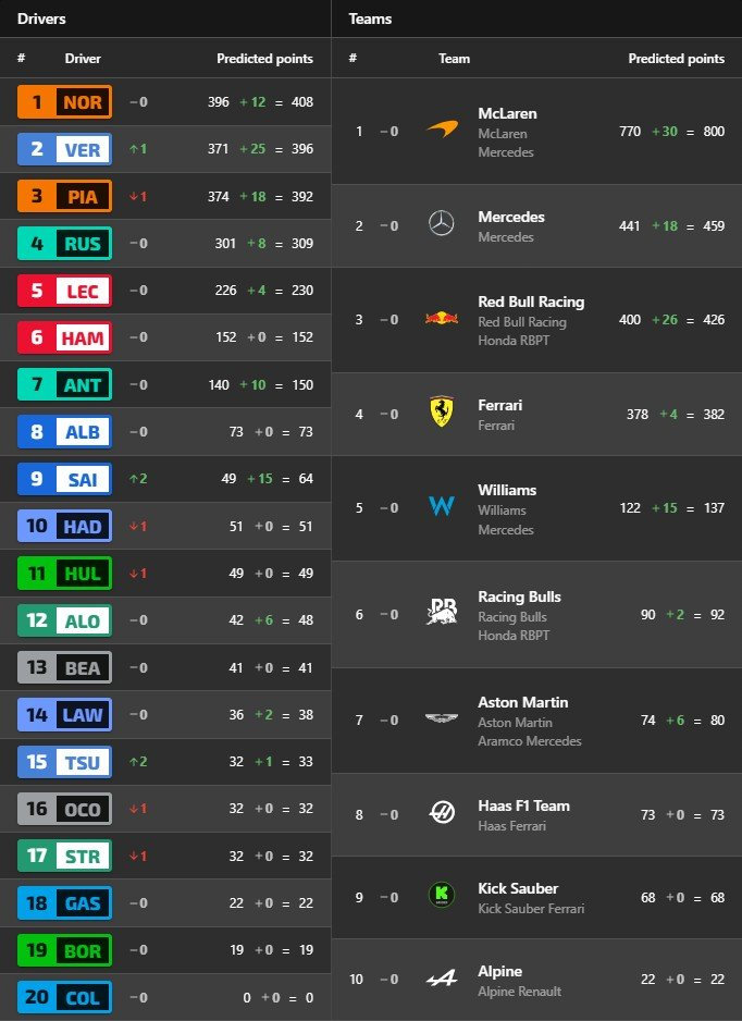 Αυτό επέτρεψε στον Verstappen ουσιαστικά ανενόχλητο να κατακτήσει την 7η νίκη του στη φετινή σεζόν, ισοφαρίζοντας αυτές των Norris και Piastri, για να βρεθεί μόλις 12 βαθμούς μακριά από τον επικεφαλής της βαθμολογίας, Lando Norris. Μάλιστα, ο Βρετανός ήταν τυχερός σε διάφορες φάσεις του αγώνα, έχοντας χάσει τη δεύτερη θέση στην εκκίνηση από τον Verstappen, σπινάροντας στα πρώτα μέτρα από τη σκονισμένη πλευρά της πίστας.