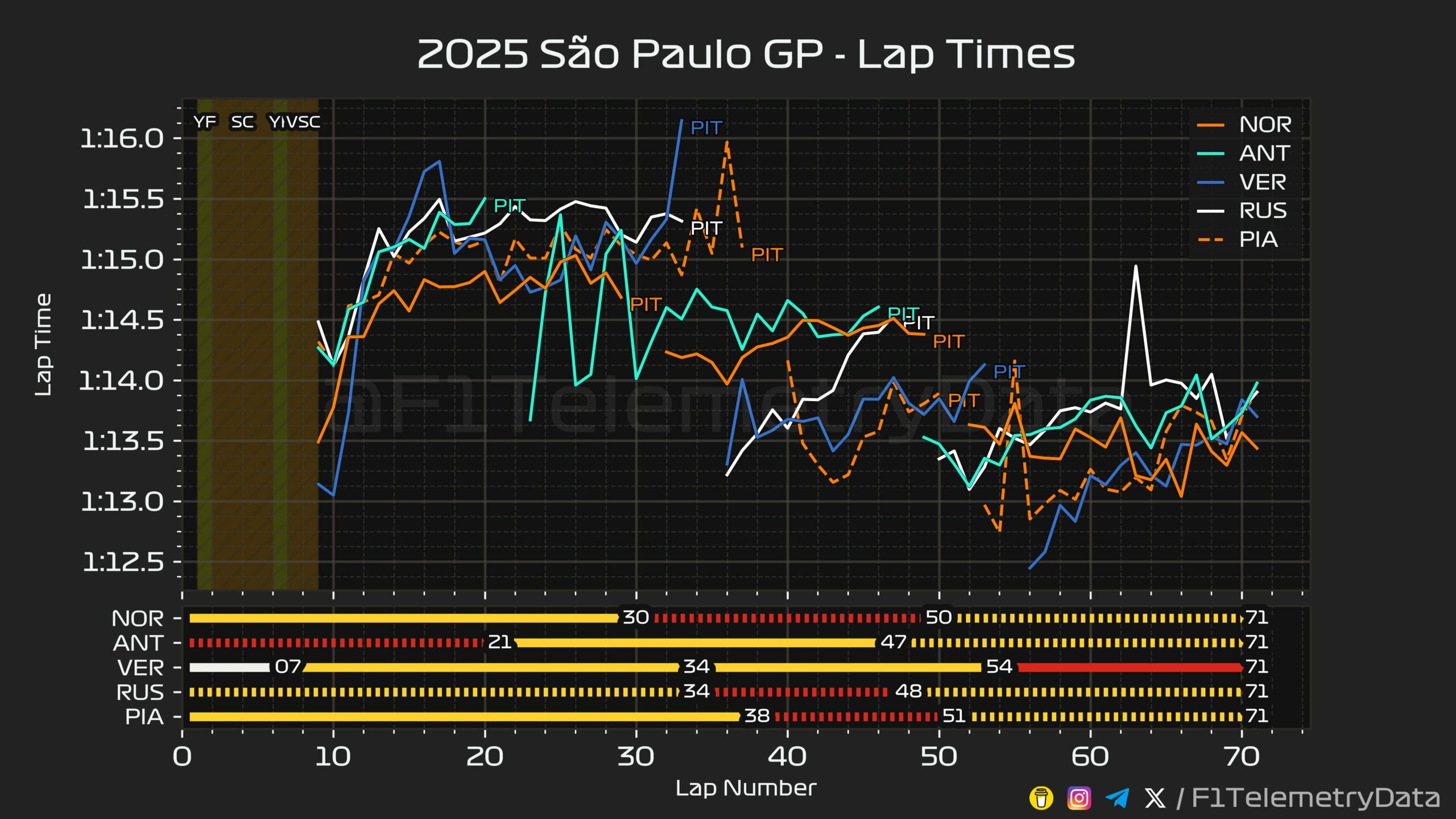 Με τραυματισμένο εμπρός αριστερό ελαστικό από το μπλοκάρισμα φρένων, o Piastri δεν είχε ικανοποιητικό ρυθμό στο πρώτο stint, καθώς ο Norris κατάφερε να ανοίξει με άνεση τη διαφορά μεταξύ τους. Αν είχε καταφέρει να χτίσει μεγαλύτερη διαφορά εκεί, το τελικό αποτέλεσμα ίσως να ήταν καλύτερο.