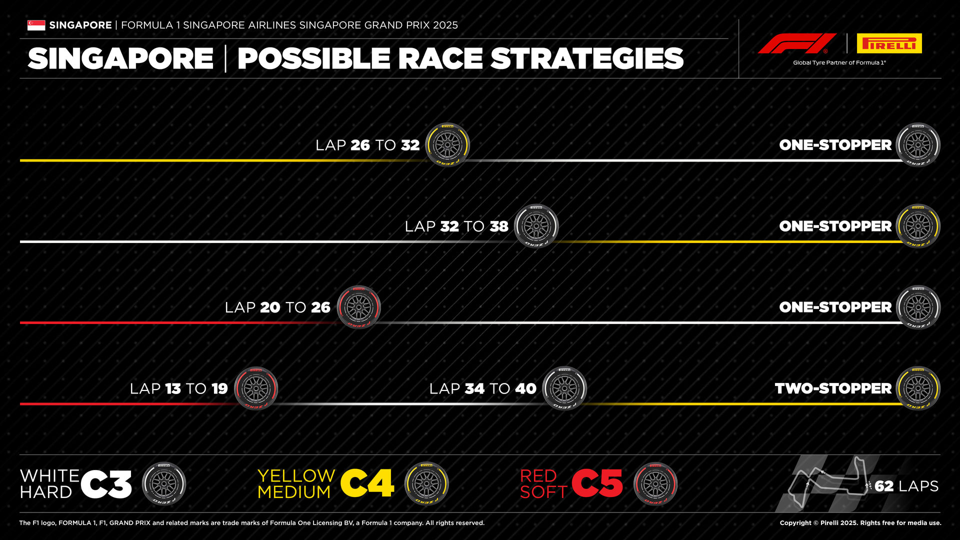 Για αυτό και οι περισσότεροι πρωτοπόροι αναμένεται να ακολουθήσουν στρατηγική ενός pit stop, εκκινώντας με τη μέση γόμα και να μεταβούν στα σκληρά ελαστικά στο πλαίσιο των γύρων 26-32 από τους 62 συνολικά. Άλλωστε, όλοι οι οδηγοί διαθέτουν μόνο ένα σετ μέσης γόμας και ένα σετ σκληρών ελαστικών για τον αγώνα με αυτούς της Aston Martin να τα έχουν «πατήσει» για ένα αργό γύρο, ώστε να παρατείνουν τη ζωή τους στον αγώνα. Αυτοί που βρίσκονται σε πιο πίσω θέσεις, ίσως επιλέξουν να εκκινήσουν με τη σκληρή γόμα, επεκτείνοντας το πρώτο stint τους για να εκμεταλλευτούν την ελεύθερη πίστα και ίσως κάποια παρέμβαση του αυτοκινήτου ασφαλείας για να κερδίσουν έδαφος.