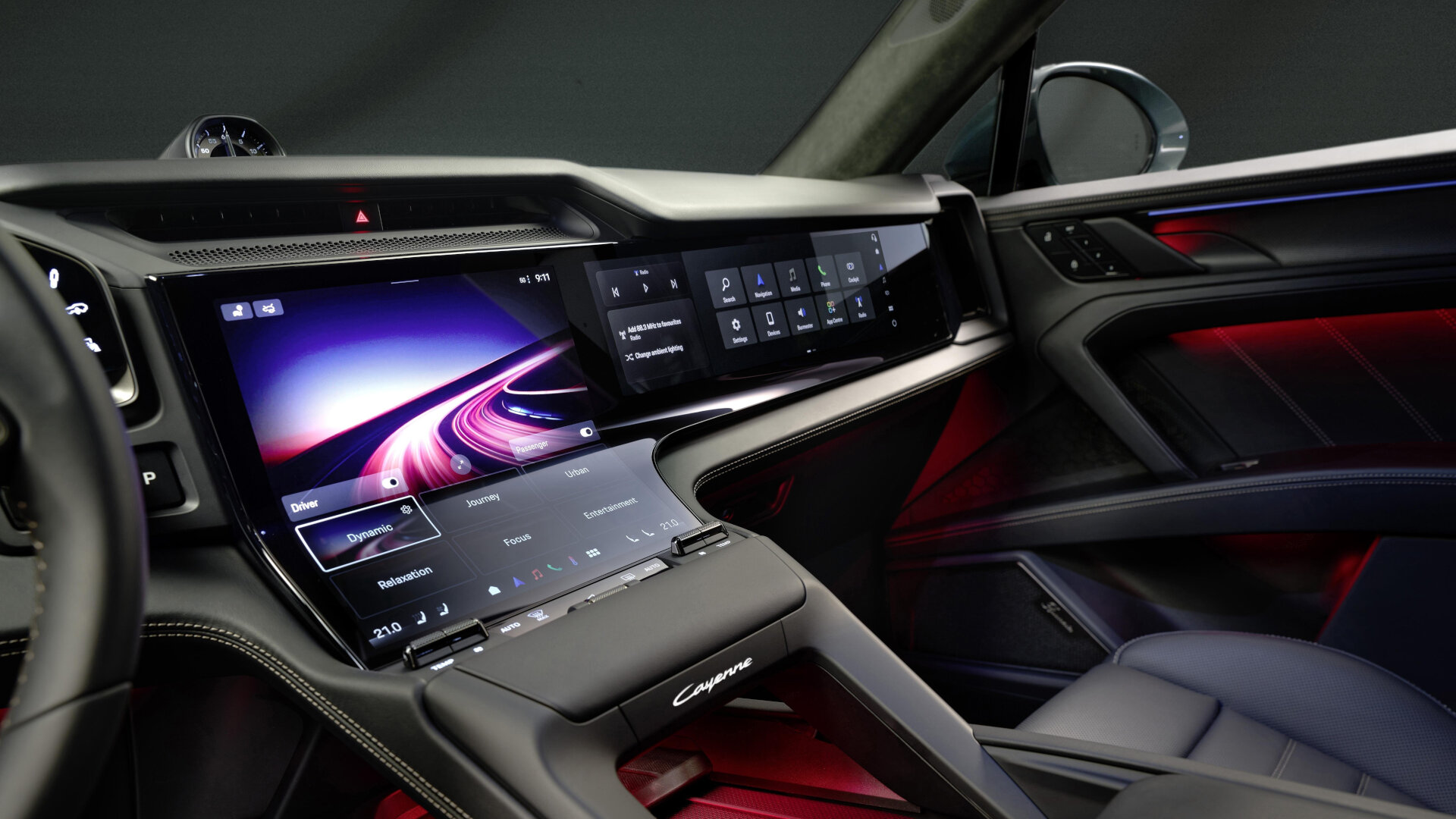 Η πρώτη ματιά στο εσωτερικό της Cayenne Electric καταλήγει αναπόφευκτα στην νέα κεντρική οθόνη 12,25 ιντσών. Ονομάζεται «Flow Display» και ξεκινά από το πάνω μέρος του ταμπλό, καταλήγοντας στην κεντρική κονσόλα. Πρόκειται για μια κυρτή οθόνη, που ενσωματώνει τα περισσότερα από τα χειριστήρια του κλιματισμού.