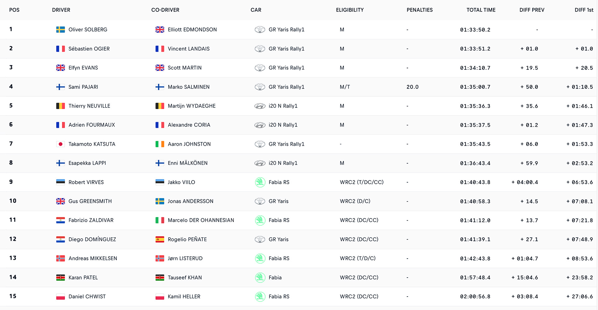 Στο WRC2, ο Εσθονός Robert Virves (9ος γενικής κατάταξης), με Skoda Fabia RS, προηγείται του περυσινού νικητή της κατηγορίας, Gus Greensmith (Toyota GR Yaris Rally2), με διαφορά 14,5 δλ.