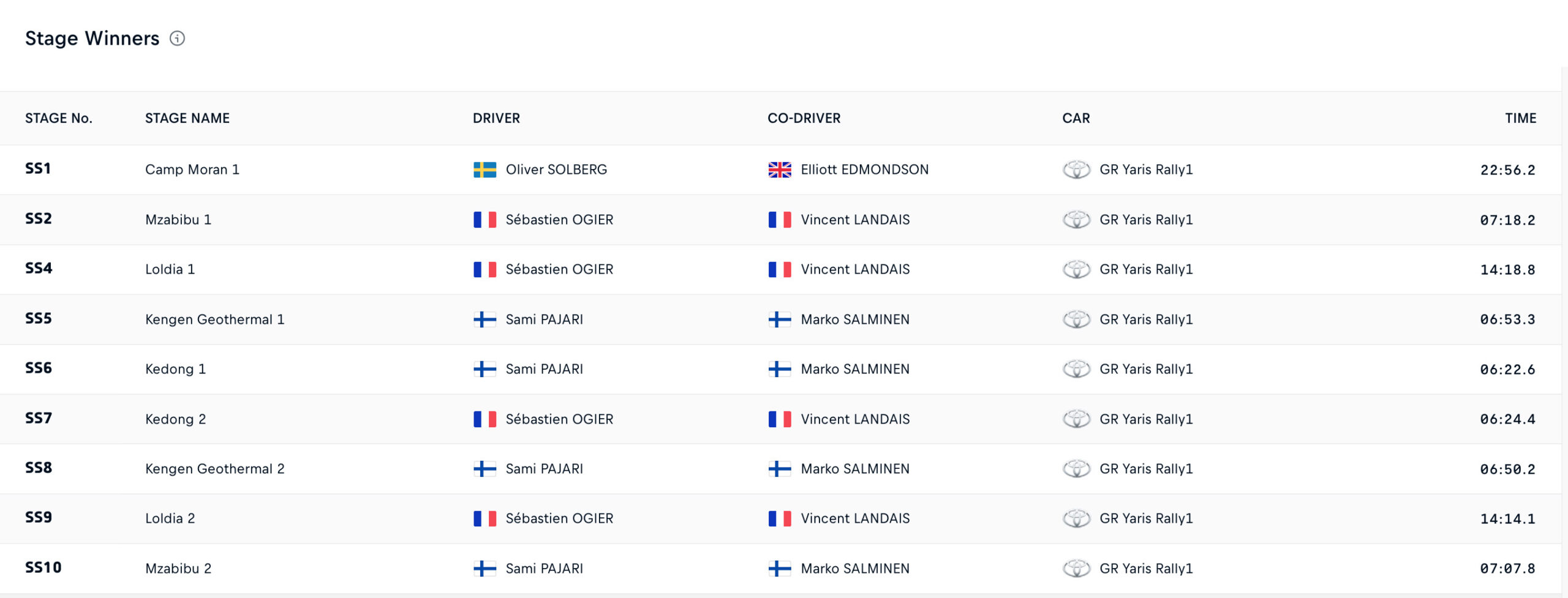 Η Toyota Gazoo Racing εξακολουθεί να κυριαρχεί στον αγώνα, με τα πληρώματά της να καταλαμβάνουν τις τέσσερις πρώτες θέσεις και έχουν σημειώσει τον ταχύτερο χρόνο σε όλες τις ειδικές διαδρομές, με τον πολύπειρο Ogier να ανταλλάσσει ταχύτερους χρόνους με τον νεαρό Φινλανδό Sami Pajari, που έχει βρει εξαιρετικό ρυθμό στις προκλητικές συνθήκες της Κένυας.