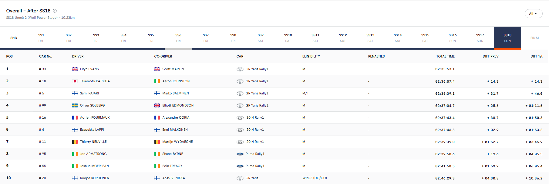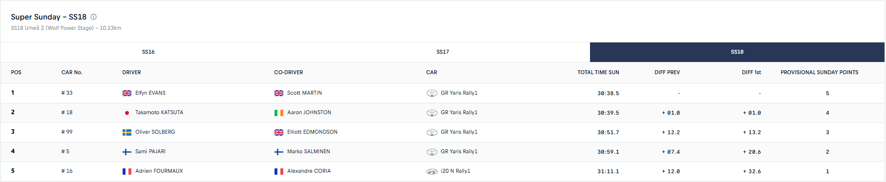 Ο Oliver Solberg τερμάτισε τέταρτος και ψαλίδισε την διαφορά του από τον Pajari στο τέλος της ΕΔ16. Ωστόσο, ο Pajari ανέκαμψε στην ΕΔ17 και παραλίγο να κλέψει τον ταχύτερο χρόνο από τον Katsuta, καθώς ήταν για ένα δέκατο του δευτερολέπτου πιο αργός.