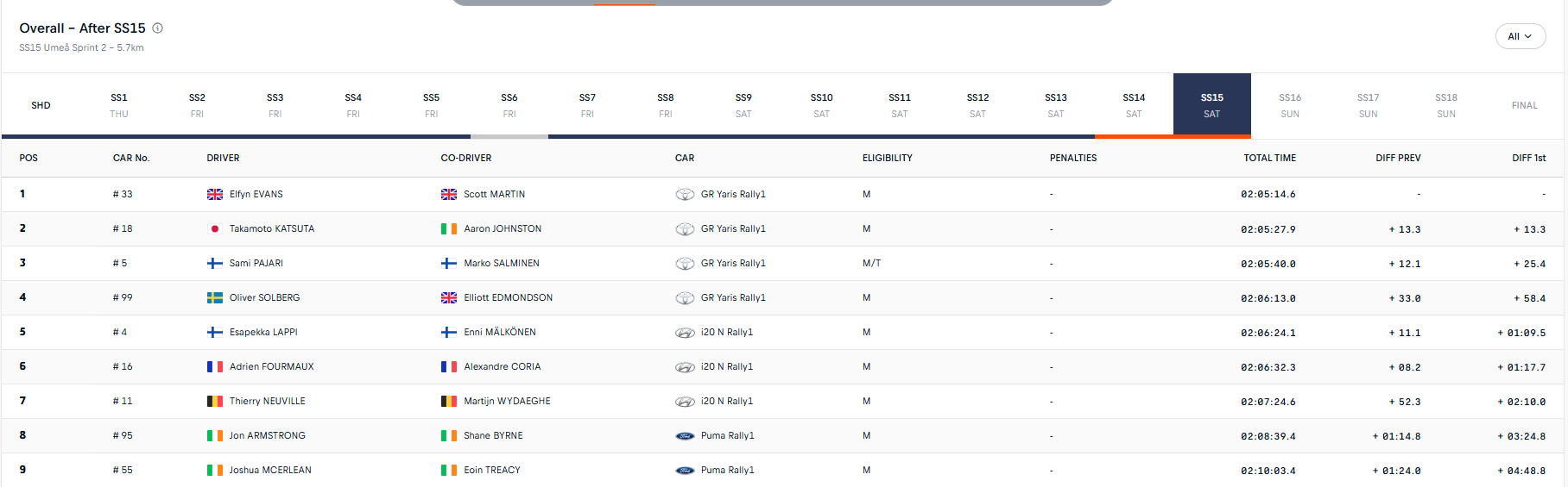 Μετά το τέλος του Σαββάτου, ο Elfyn Evans πήρε πίσω την πρωτοπορία του αγώνα της Σουηδίας από τον Takamoto Katsuta, με τον Sami Pajari να ακολουθεί.