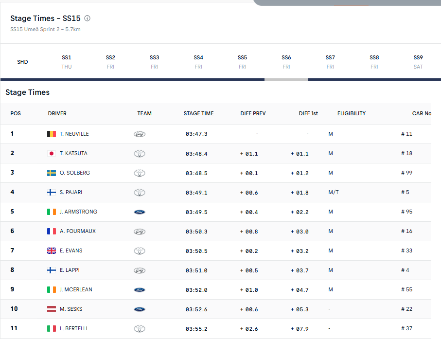 Ο Esapekka Lappi έπεσε στην πέμπτη θέση, αλλά κατάφερε να μειώσει την διαφορά του από τον τέταρτο Oliver Solberg στα 5,5 δευτερόλεπτα στην ΕΔ12. Ο Φινλανδός οδηγός θα προσπαθήσει να παλέψει την Κυριακή ώστε να μην τερματίσει στην πέμπτη θέση.